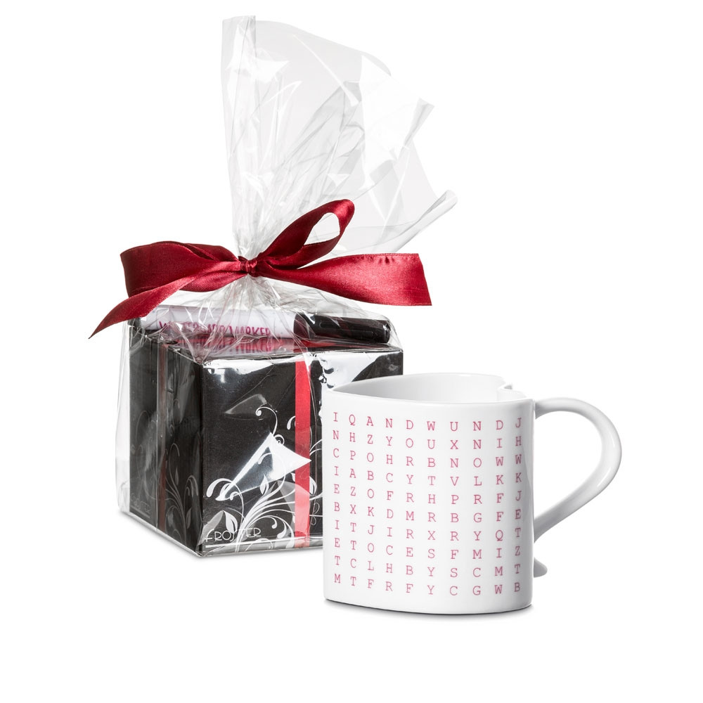 Der Becher in Form eines Herzens mit einer Nachricht zum Finden.